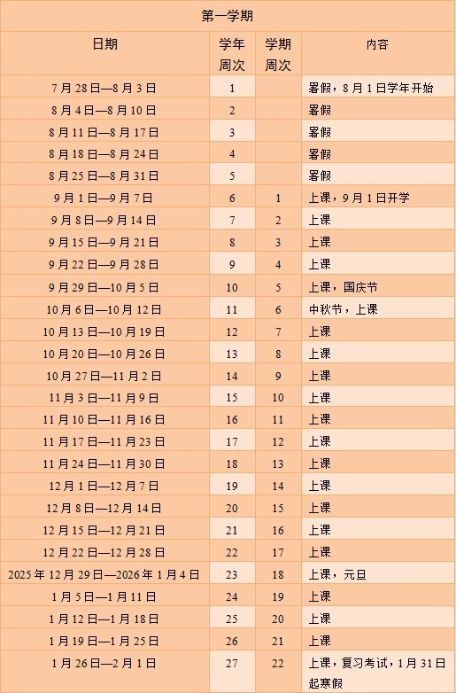 说明:全学年52周,法定节假日放假调休日期的具体安排以国务院办公厅通知为准。每学年教学时间40周(含复习考试),周学时一般为28。岗位实习按每周30 学时安排。如有调整,将另行通知。