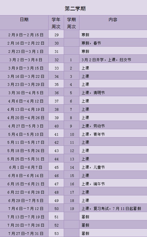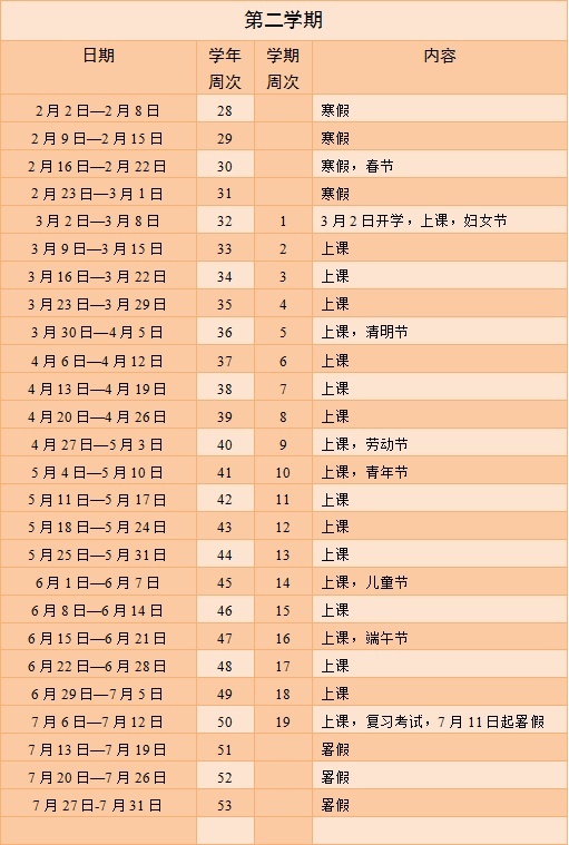 3.寒暑假、国家法定节假日共13周;国家法定节假日按国务院放假规定安排;儿童节、青年节可按规定放假或组织活动。